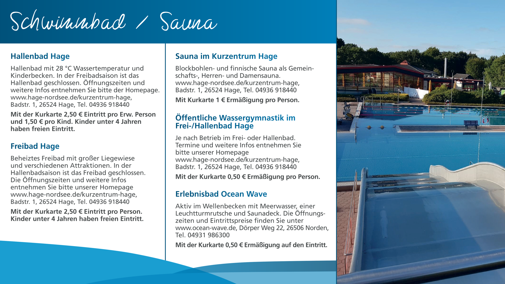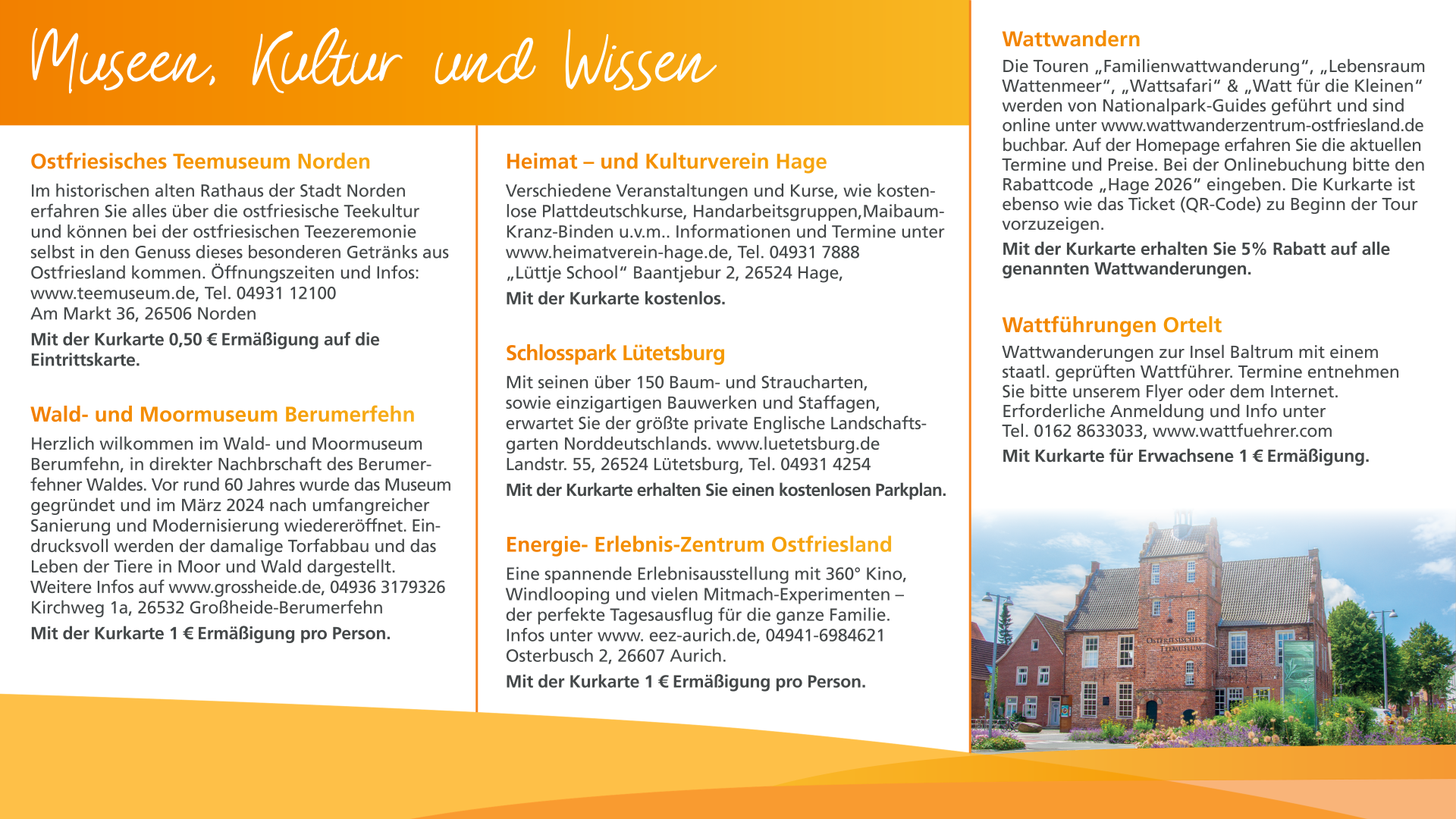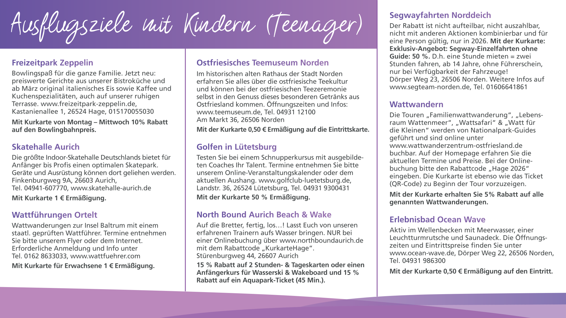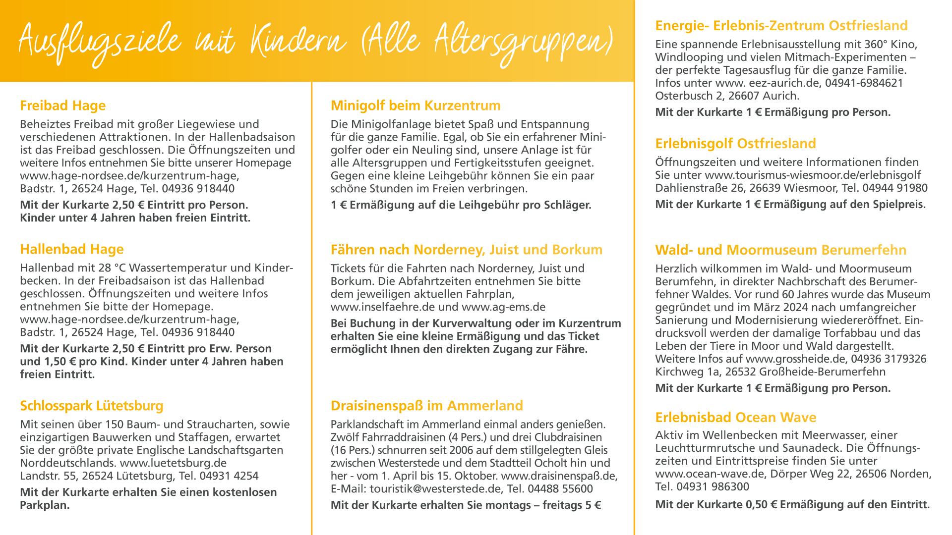 Mit unserer Kurkarte haben Sie viele Ermäßigungen, kostenlose Eintritte und können dabei richtig sparen. Ob freien Eintritt am Strand, Ermäßigungen auf tolle Veranstaltungen hier in Hage und auch in der Region. Vergünstigungen auf Fahrkarten für Inselausflüge nach Borkum, Juist und Norderney, sowie für Sonderfahrten.Aber auch unser Frei- bzw. Hallenbad in Hage ist von unserer Kurkarte nicht ausgeschlossen. Selbst der Saunabesuch im Kurzentrum Hage wird mit der Kurkarte vergünstigt. Auch bei Wattführungen sparen Sie bei Vorlage der Kurkarte. Der Schlosspark Lütetsburg hat eine kleine Erinnerung für unsere Kurkarteninhaber parat.