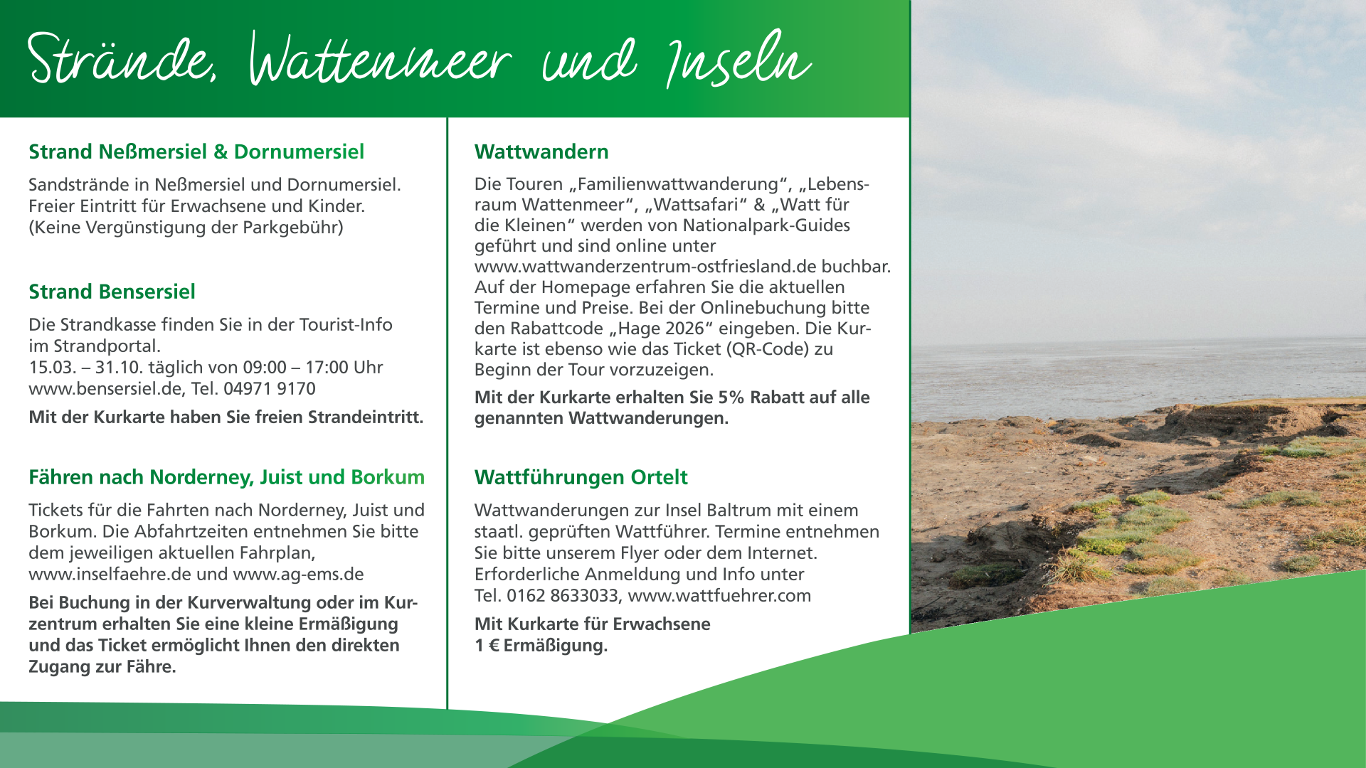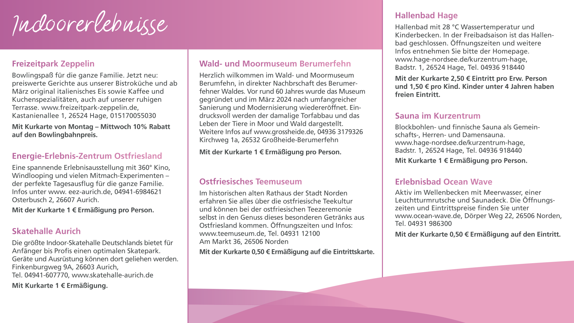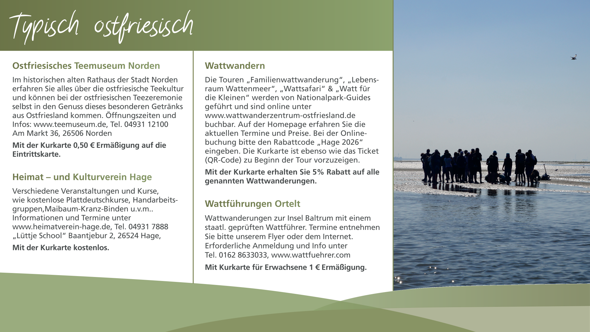 Mit der Kurkarte verbinden Sie einen entspannten Urlaub mit der Möglichkeit, Vergünstigungen für Leistungen während Ihres Aufenthalts in Hage in Anspruch zu nehmen, andere Angebote sind mit der Kurkarte kostenlos.